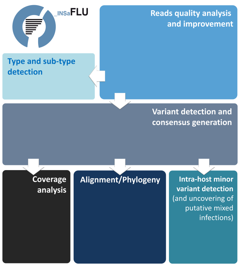This module provides the first-line "genetic data" for seasonal influenza laboratory surveillance, i.e. the list of variants (SNPs and indels) and their effect at protein level and also consensus sequences (at both the locus and whole-genome levels). The latter constitutes the whole basis for the downstream phylogenetic inferences driving the continuous tracking of influenza temporal/geographical spread.